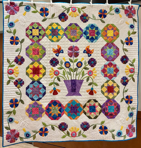 “Cone Flowers”, a beautiful queen-size quilt pieced and appliquéd by Lorri Conway and machine quilted by Lynette Harlan - Blue Wave Quilts.
